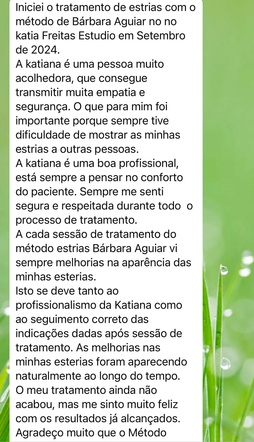 Katiana de Freitas Boaventura, Brasileira natural de Santa Catarina, 47 anos, casada, Formada em Estética e Cosmetologia , Especialista em Pedicure medical com laser Podologico, Depilação a laser, Criolipolise (criomodelagem, celulite, gordura localizada, lipedema). Primeira (1.ª) Habilitada em Portugal e Europa, do método Bárbara Aguiar tratamento para estrias, desde maio de 2022, Formadora e Monitora do Método, Amo estudar, amo cuidar de pessoas com a missão de resgatar a sua auto-estima, Esteticista ha 28 anos.
